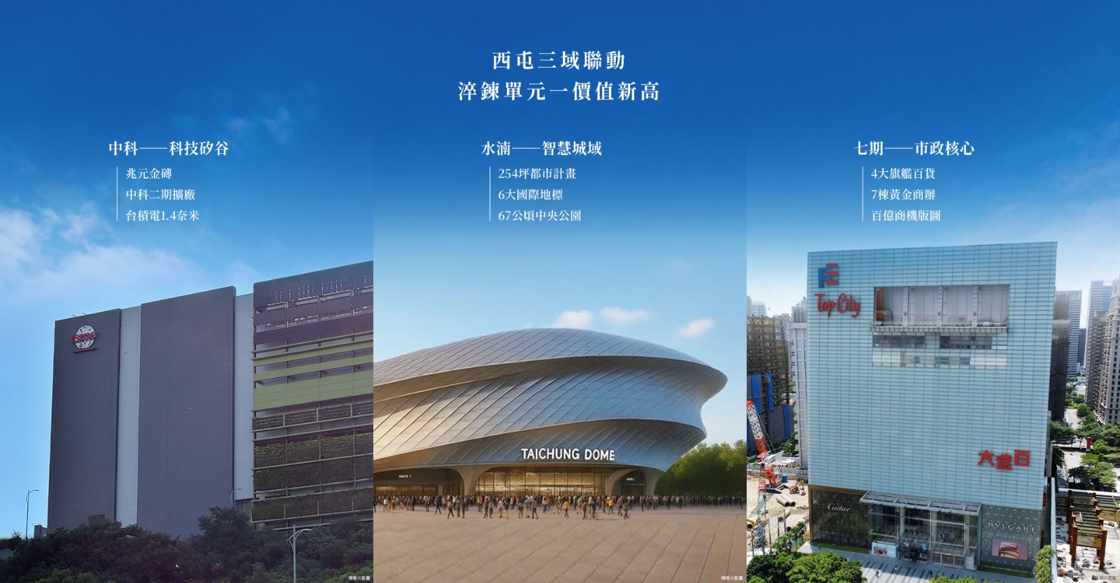 本案以「中心之重、三域聯動」為定位,從中科菁英圈為起點,延伸銜接七期市政帶與水湳經貿核心,價值板塊同步共振。台積電二期啟動,再度推升中科產業量能,邁向兆元級經濟圈,聚匯三勢菁英層峰於鄰!漫步近接台灣大道黃金軸線,未來享捷運藍線B12站紅利,帝王門牌價值乘勢起漲!